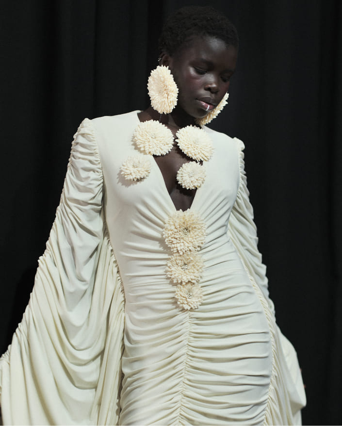 Flowers establish themselves as one of the strongest visual languages of the season, appearing in versions that range from bold to subtle. They are seen in large-scale applications acting as focal points, but also hand-painted—as in Isabel Sanchís—adding artisanal finishes that turn each design into a unique piece. Other brands, such as Mariano Moreno, reinterpret them in theatrical and colourful ways. Organic, embroidered, printed, or lace-integrated botanical florals also appear. As Yolancris’ creative director Yolanda Pérez reminds us: “I’ve always loved lace. It has a strong sense of nature because it’s all flowers.”